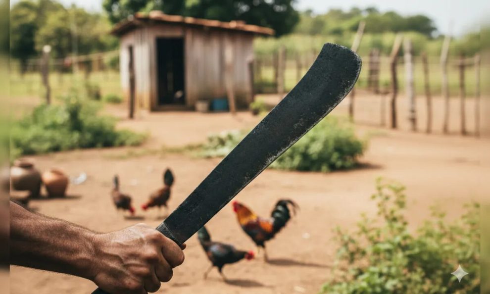 A mulher relatou que seu neto utilizou um facão para intimidá-la após ser questionado sobre o cuidado com aves na propriedade.